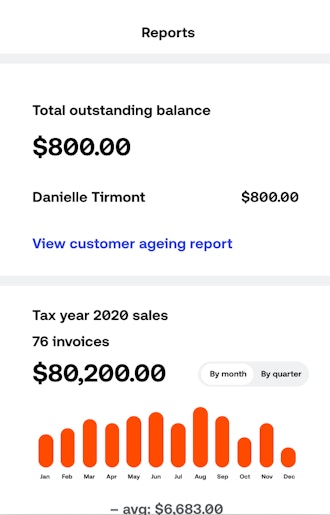 The overview dashboard is a summary of overdue, unpaid, and unsent invoices, pending quotes, and tax year sales. Tap any of these business reports for a more detailed breakdown.